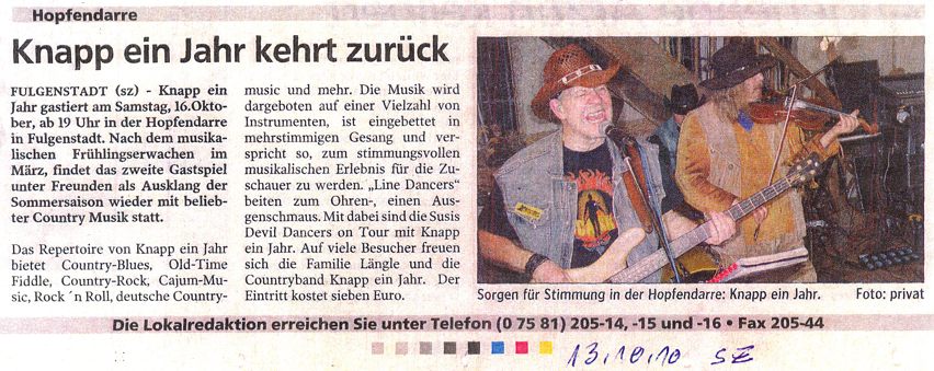 | 11.10.2010 | Anzeiger Konstanz | Bildbericht | Country & Western Festival KN-Wollmatingen | jpg (303KB) |